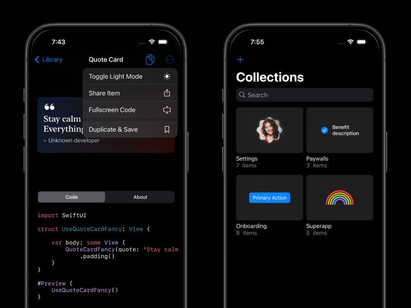 Compot is an iOS app where you can find SwiftUI components for your apps. It is designed to make it easy to browse predesigned components by keywords and copy or share the code you find useful. You can save components you like and organize them in custom collections. This way you can create a collection with components for your new app, or based on common themes like paywalls, or onboarding.